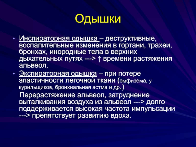 Экспираторная одышка (проблема выдоха). Характерна для пациентов с ХОБЛ и эмфиземой легких.