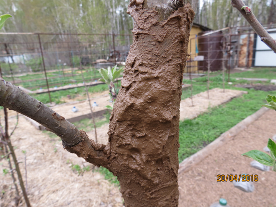 Вот, по сути и все. Осталось низ и верх обмотать пленкой, а если это сделать невозможно по причине большой толщины ствола, то просто замазать садовым варом включая места погрызов тоже.