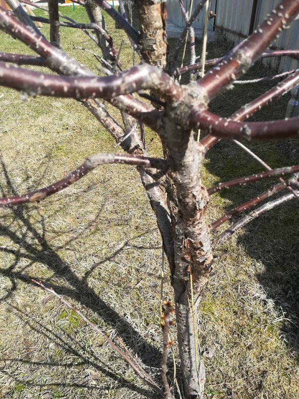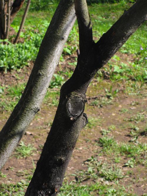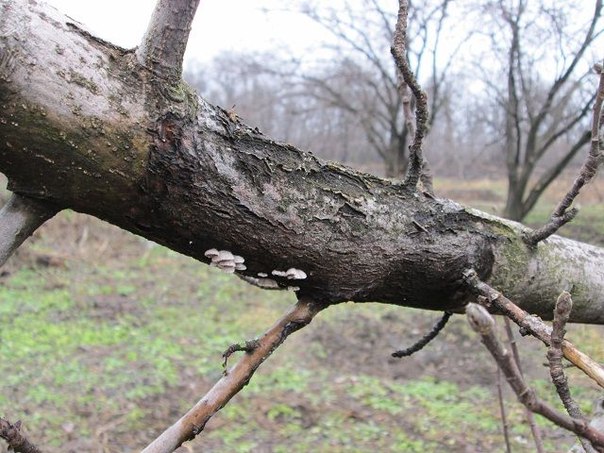 Далее места эти напротив начинают вспучиваться и кора словно по мановению волшебной палочки вдруг сворачивается вдоль пятна разом обнажая древесину, вот те на. Ну а далее что — в открытые настежь ворота проникают различные совсем несъедобные грибы, а если это косточковая культура, то наблюдается обильнейшее камедетечение. Это самые настоявшие солнечные ожоги, образующиеся в не побеленных с осени местах штамба и скелетных сучьев.