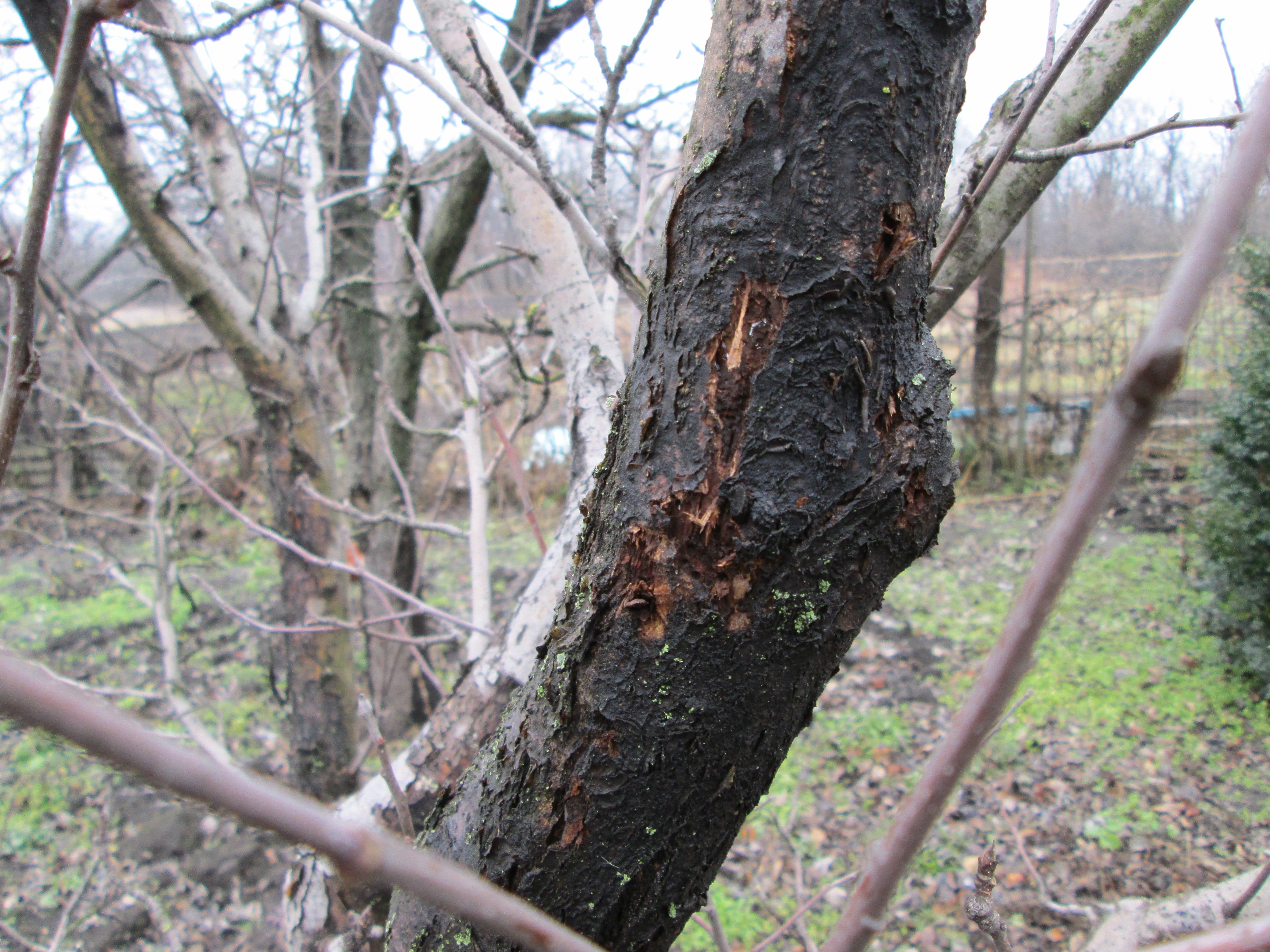Солнечные ожоги на коре плодового дерева. © Xtremehort