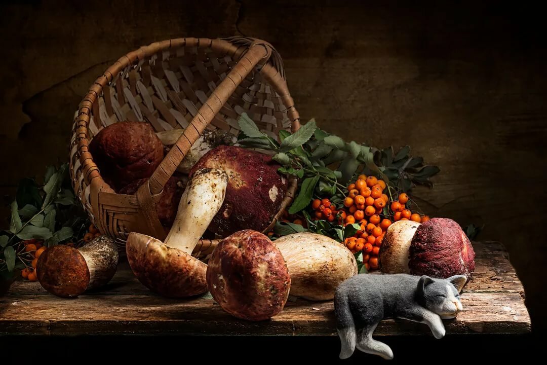 Иногда свои грибные натюрморты художница дополняет веточками с ягодами, листьями и цветами.