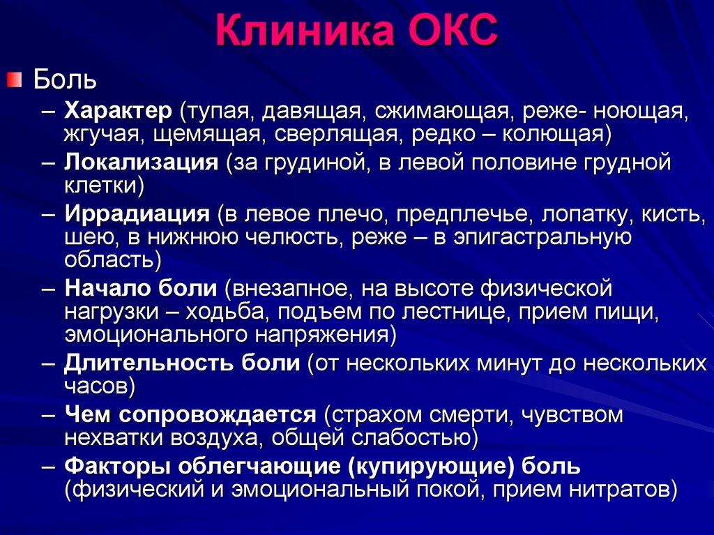 Кардинальным симптомом критического снижения притока крови к сердцу является боль в груди, которая проявляется как ощущение стеснения вокруг или над грудью и (часто, но не всегда) иррадиирует в левую руку и левый угол челюсти. Это может быть связано с потоотделением (потоотделением), тошнотой и рвотой , а также с одышкой . Во многих случаях ощущение «нетипичное», боль ощущается по-разному или даже полностью отсутствует (что более вероятно у пациентов женского пола и у пациентов с диабетом ). Некоторые могут сообщать об учащенном сердцебиении , тревоге или ощущении надвигающейся гибели ( angor animi ) и ощущении острой болезни. Описание дискомфорта в груди как давления мало помогает в диагностике, поскольку оно не является специфическим для ОКС.