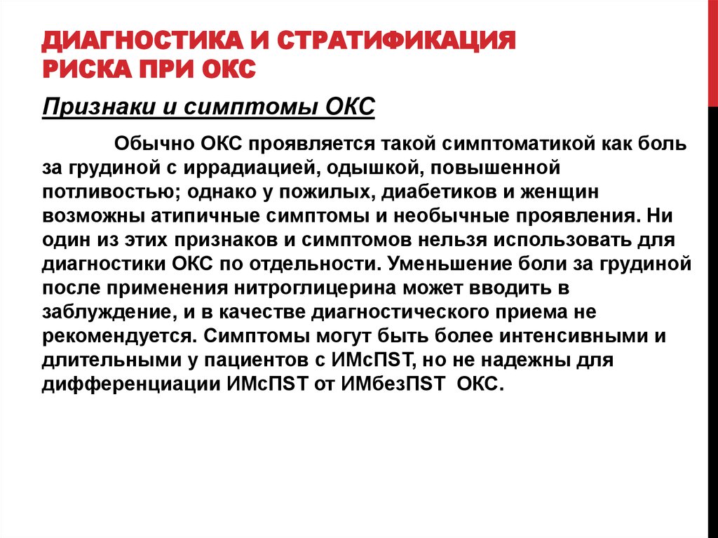 В настоящей статье рассматривается лишь ведение больных с подозрением на острый коронарный синдром, у которых отсутствует стойкий подъем сегмента ST. При этом основное внимание уделено непосредственно диагности