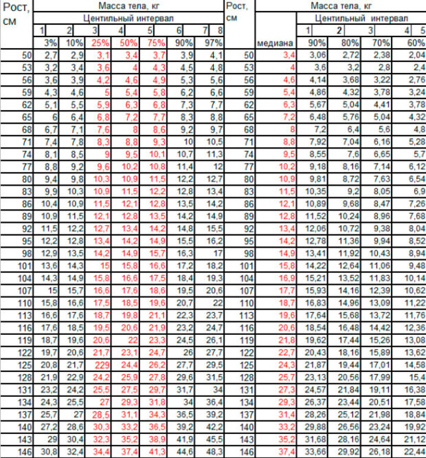 Для этого измеряется рост и вес ребенка. Полученные показатели сравниваются с данными, которые предлагает таблица 1 или 2.
