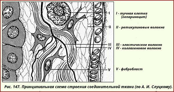 Эта ткань состоит из различных клеточных элементов и межклеточного вещества.![]()